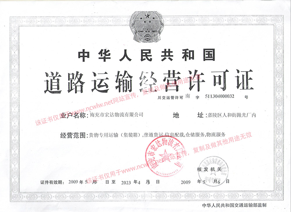 南充物流網(wǎng)(m.tongfengban.net) 南充市宏達(dá)物流有限公司道路運(yùn)輸經(jīng)營許可證